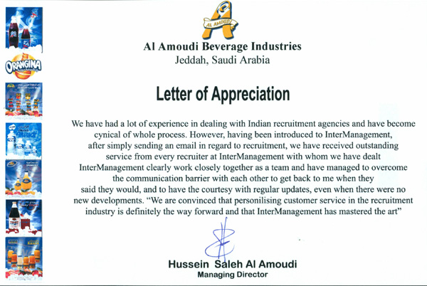Faisal Naimi Est www.fsn.com.sa We have been dealing with InterManagement Manpower Services more than 15 years for our manpower requirements from India . We have found them to the extremely professional, very helpful, dependable and most important for us reliable. We have developed a close working relationship with InterManagement Who always exceeds our expectations as well as fully meeting our needs. Intermanagement is always our first port of call when we need support , they provide an excellent friendly and carrying service. The staff they supply are highly skilled individuals wiling to adapt to any environment, who always display high levels of enthusiasm, energy and passion for the job they do. InterManagement is a thoughtfully, considerate agency that anticipates our needs and goes beyond our expectations.