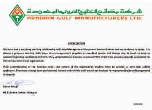 Jeedah Laminated Co www.softdreams.com.sa It is indeed my pleasure to issue the appreciation letter to InterManagement Manpower Services Ltd. We are extremely pleased with InterManagement level of professionalism and their prompt services. The quality Dr.Khalid Musa Al Ghamdi |